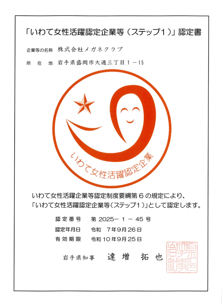 岩手県より2025年9月26 日付けで「いわて女性活躍認定企業等(ステップ1)」として認定を受けました。